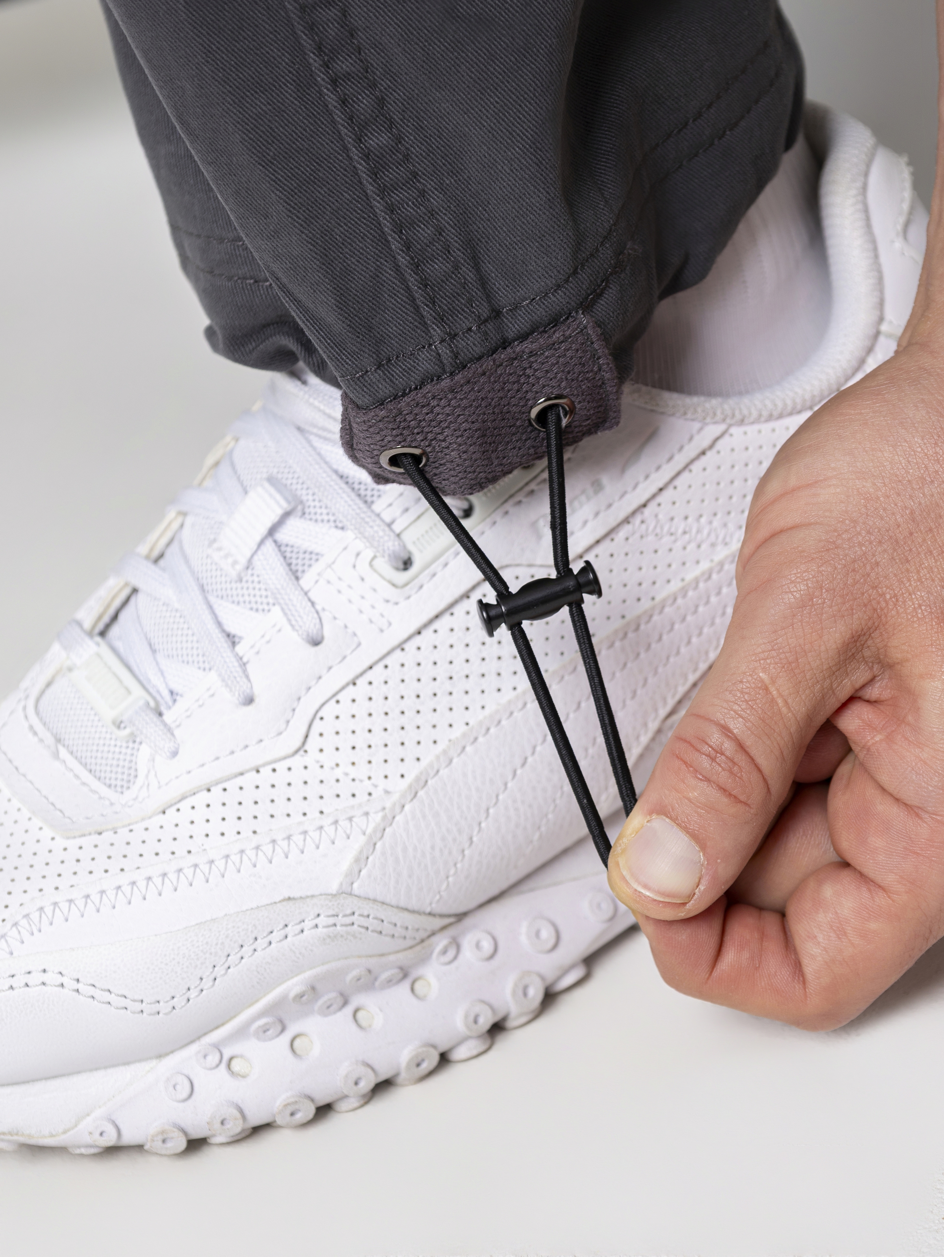 Внизу штанины имеется утяжка, по желанию можно затянуть штанины, чтобы они плотно прилегали к ноге. В виде застежки используется надежная металлическая молния и пуговица.