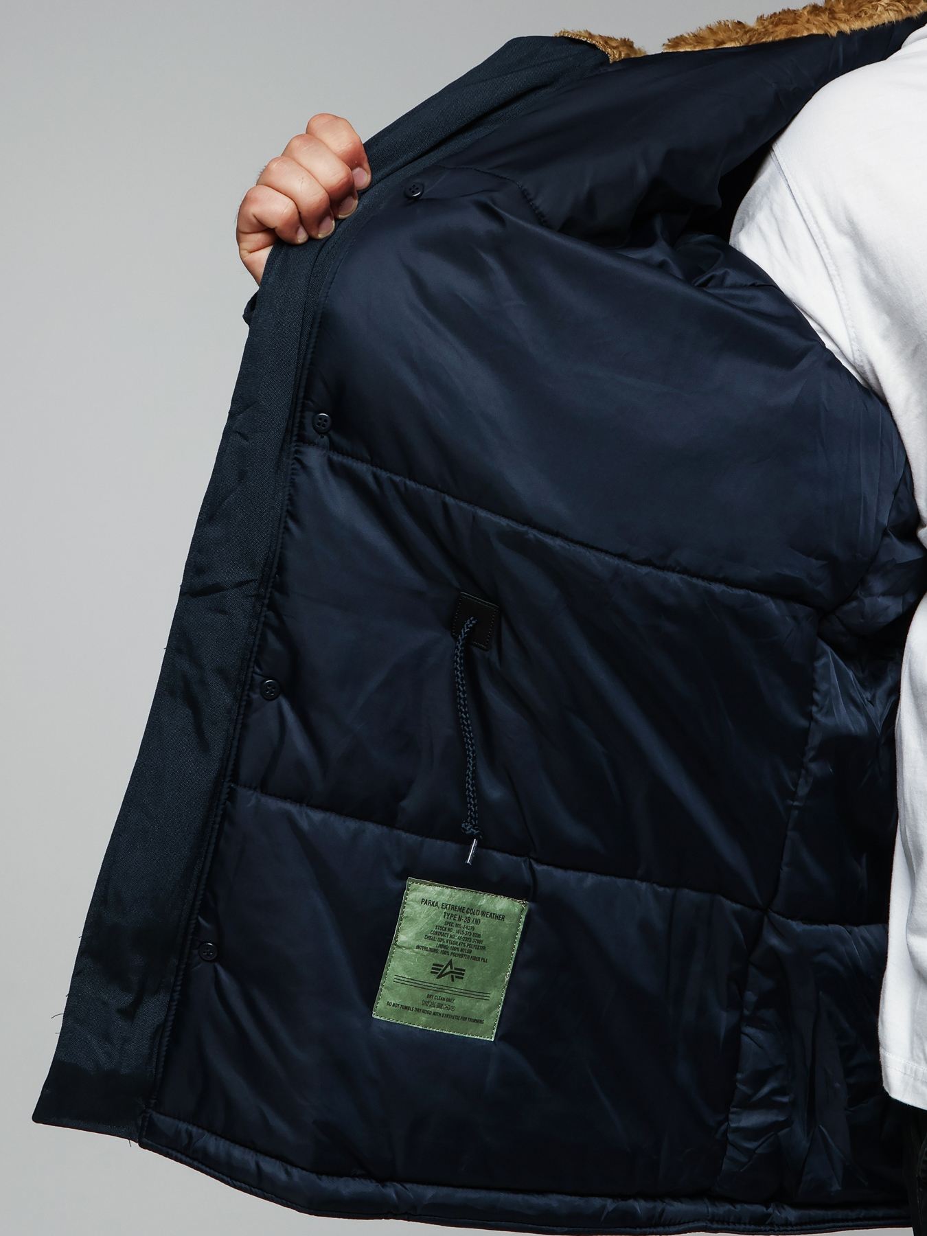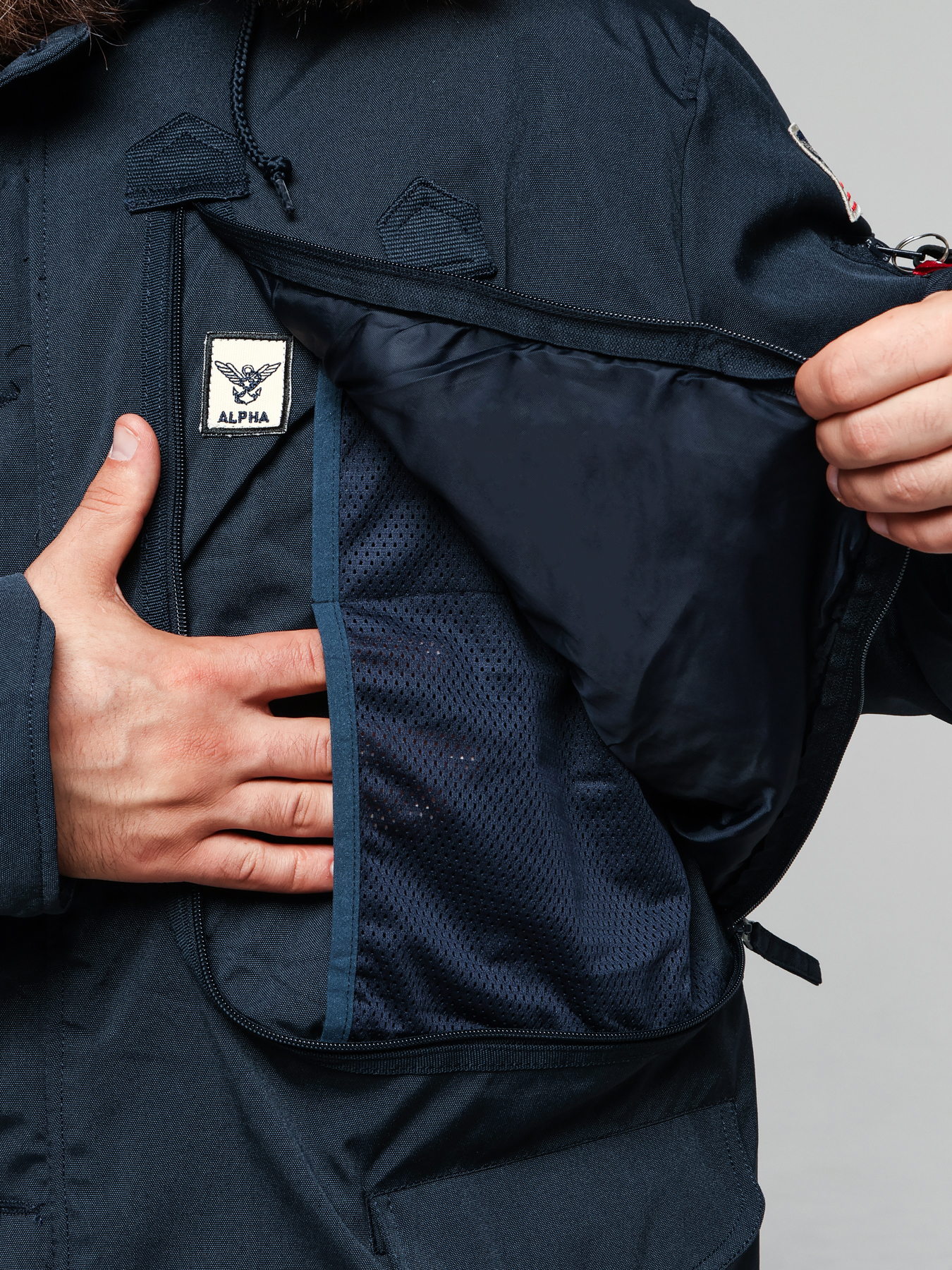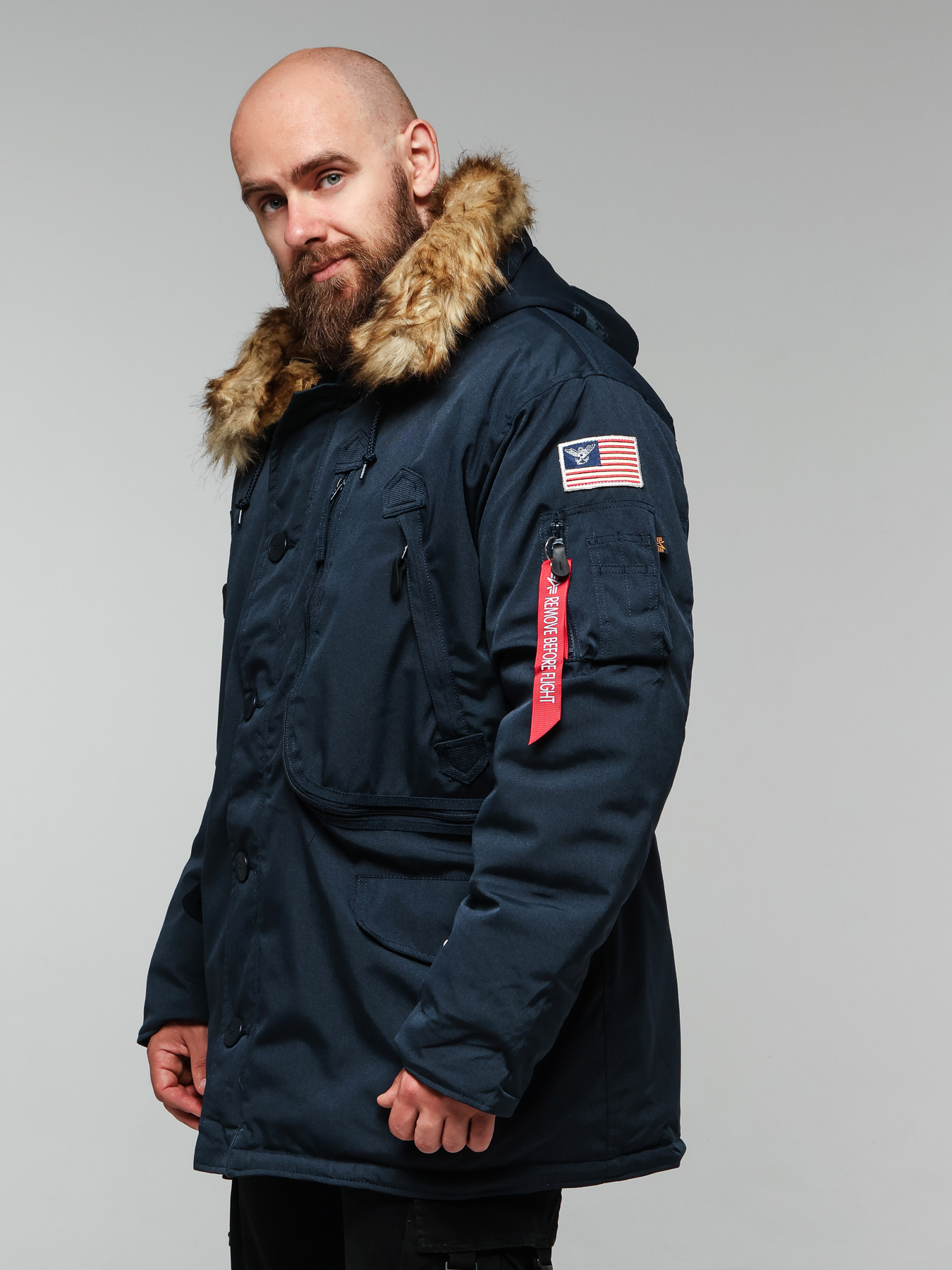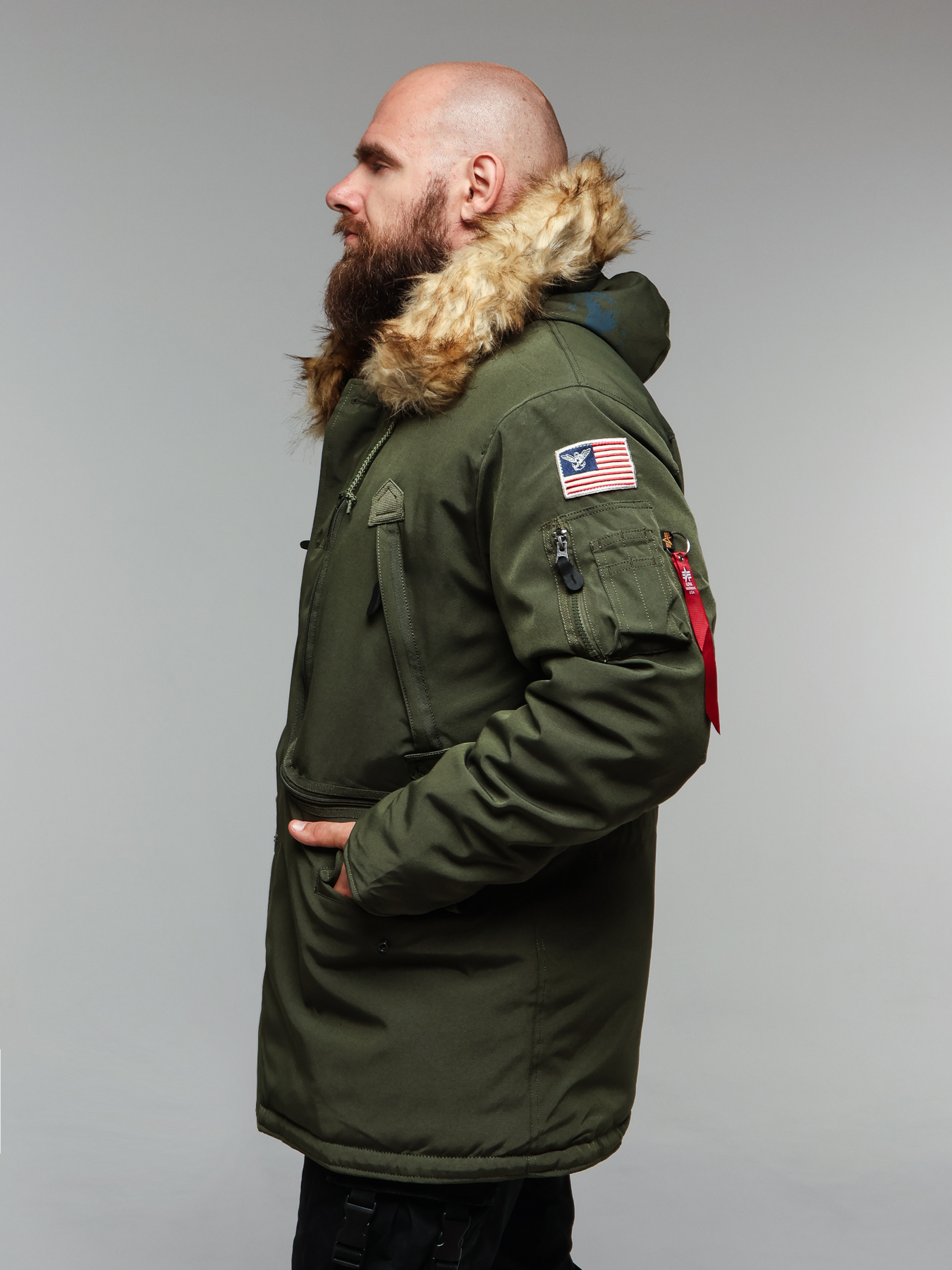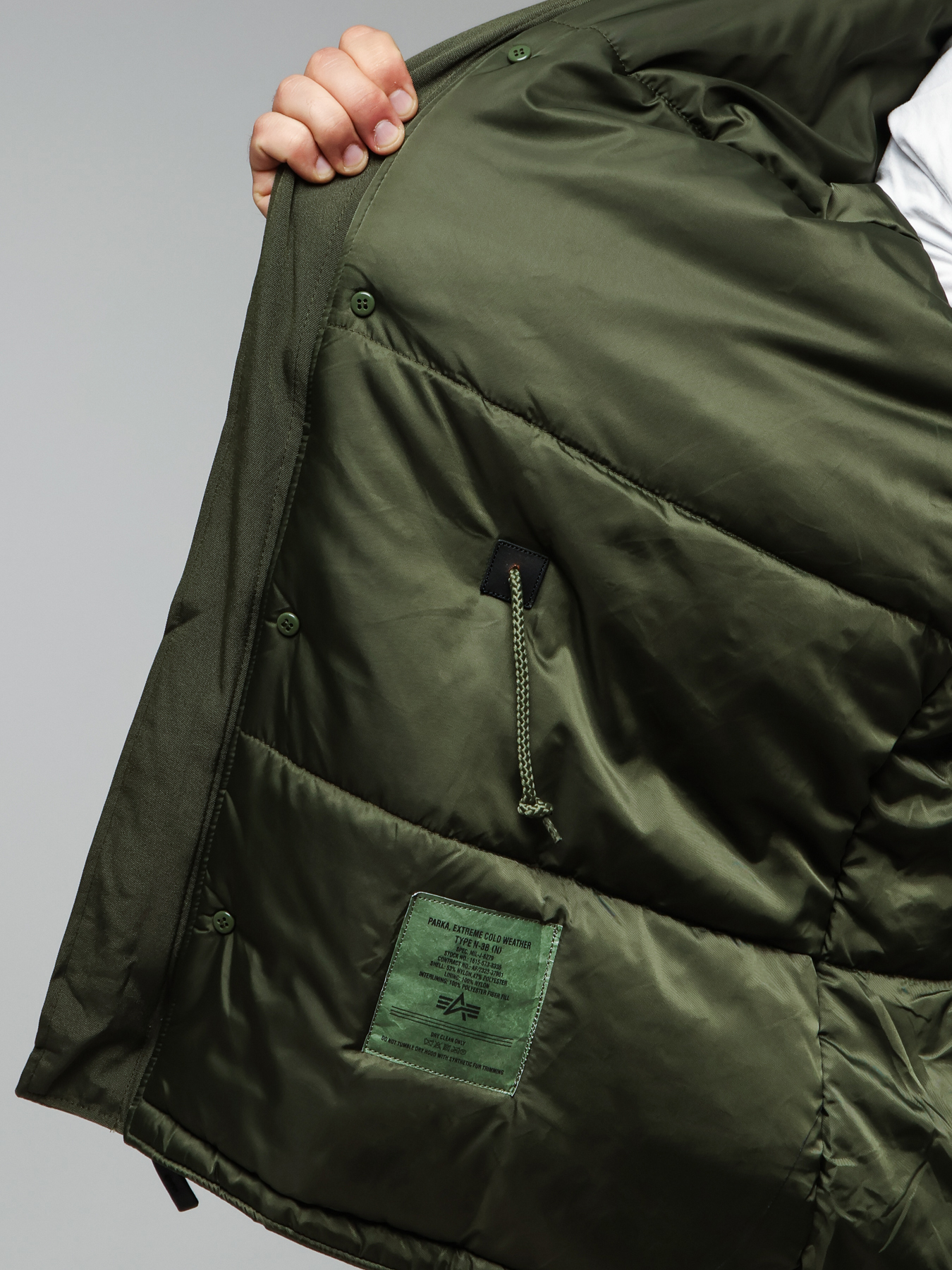 Парка Alpha Industries N-3B Alpine – теплая зимняя парка, внешний материал 53% нейлон, 47% полиэстер, утеплитель полностью из полиэстера. Есть большой карман на груди, ветрозащитный клапан застегивается на пуговицы. Регулируемый капюшон с отстегивающейся опушкой из натурального меха, изнутри отделанный ворсом, согревает шею и позволяет носить парку без шарфа. На внутренней стороне есть шнур утягивающий в поясе. Также в комплекте на рукаве яркий красный брелок-лента.