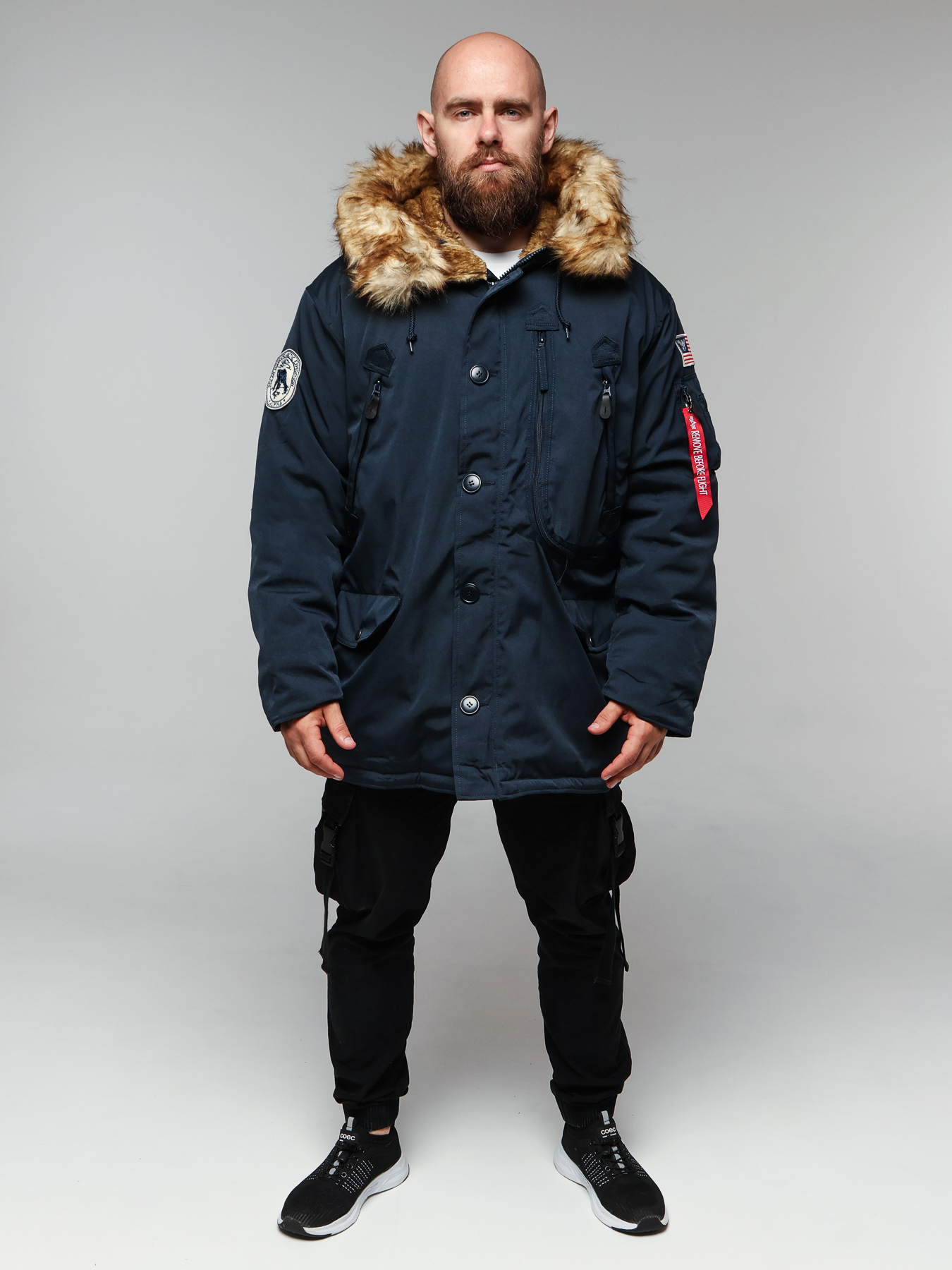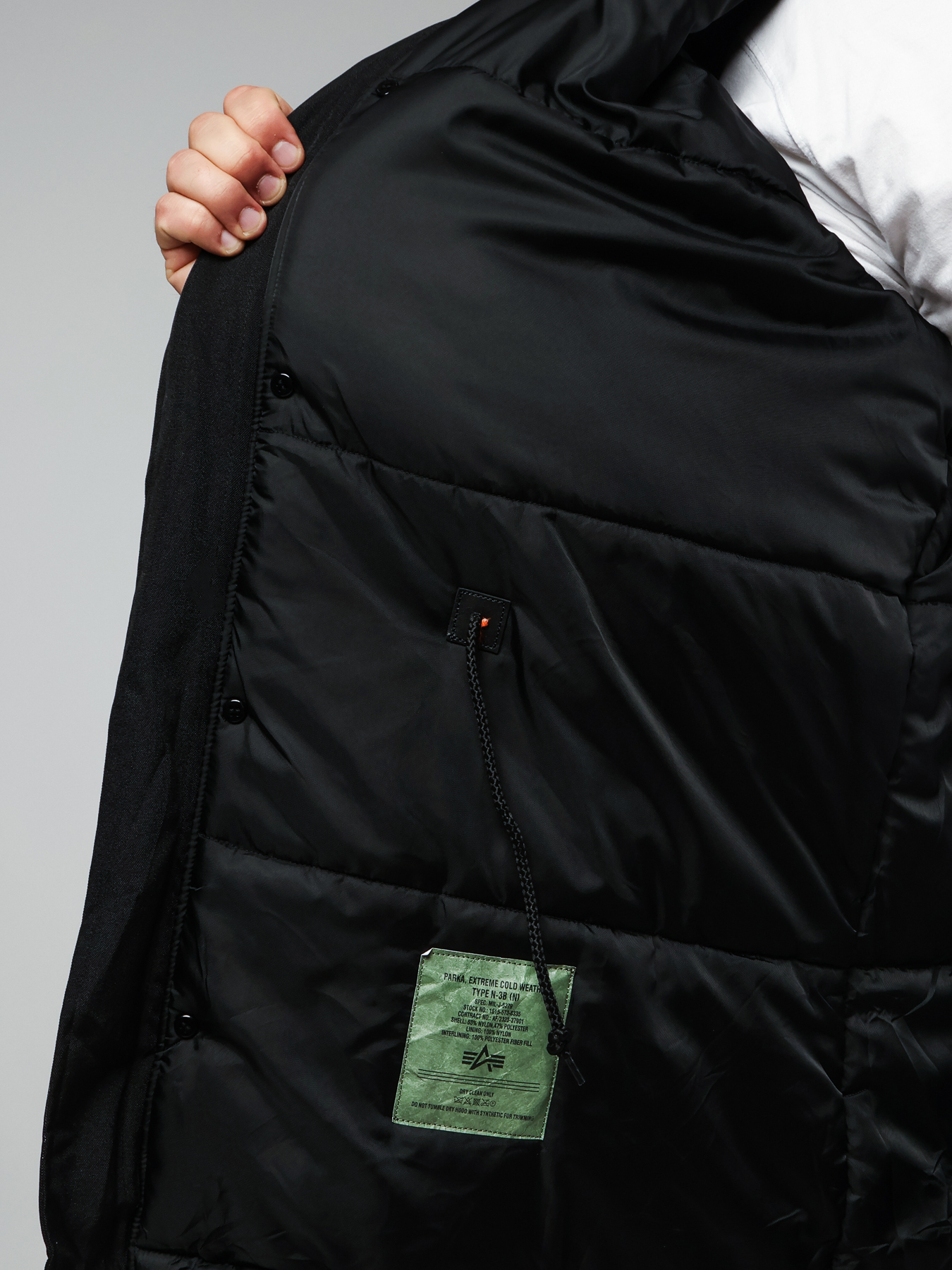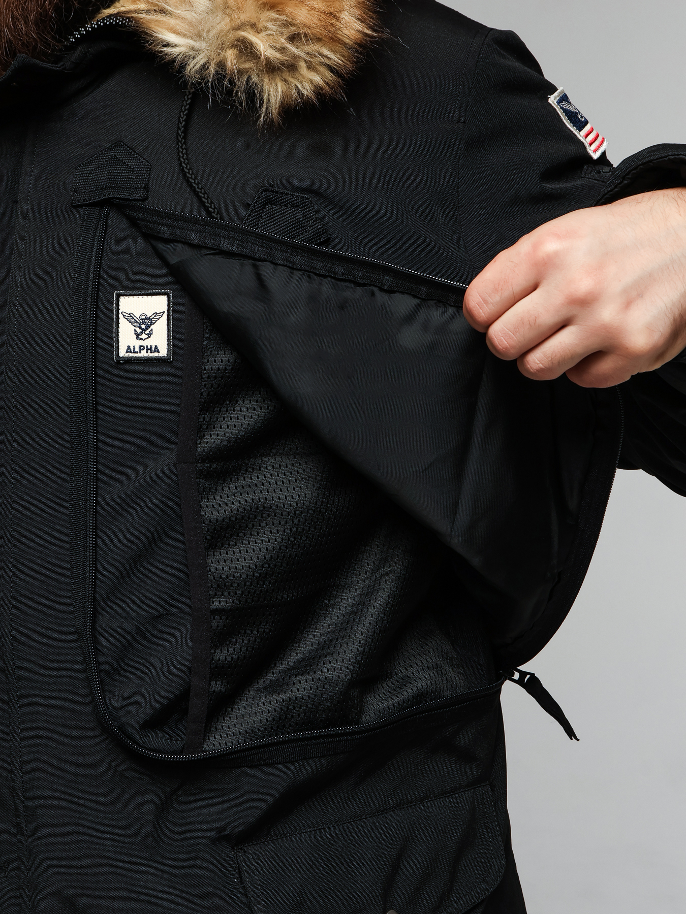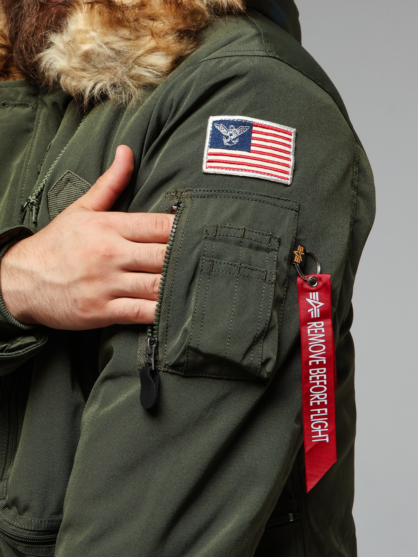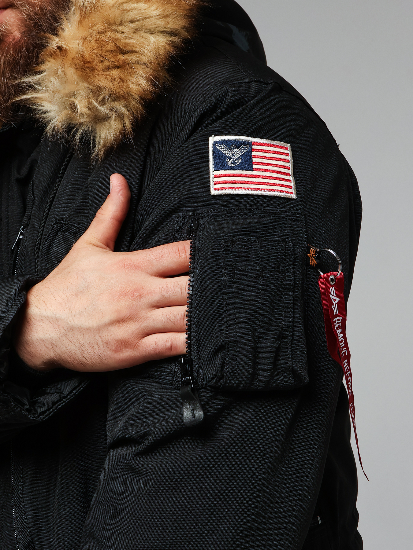 Парка Alpha Industries N-3B Alpine – теплая зимняя парка, внешний материал 53% нейлон, 47% полиэстер, утеплитель полностью из полиэстера. Есть большой карман на груди, ветрозащитный клапан застегивается на пуговицы. Регулируемый капюшон с отстегивающейся опушкой из натурального меха, изнутри отделанный ворсом, согревает шею и позволяет носить парку без шарфа. На внутренней стороне есть шнур утягивающий в поясе. Также в комплекте на рукаве яркий красный брелок-лента.