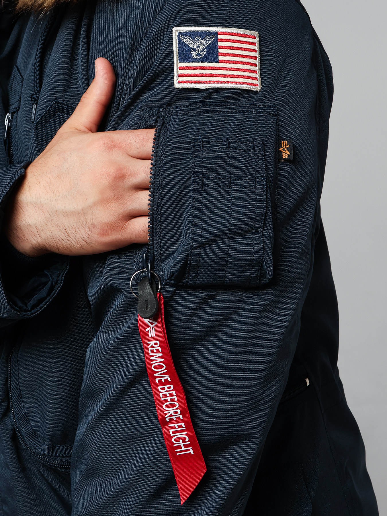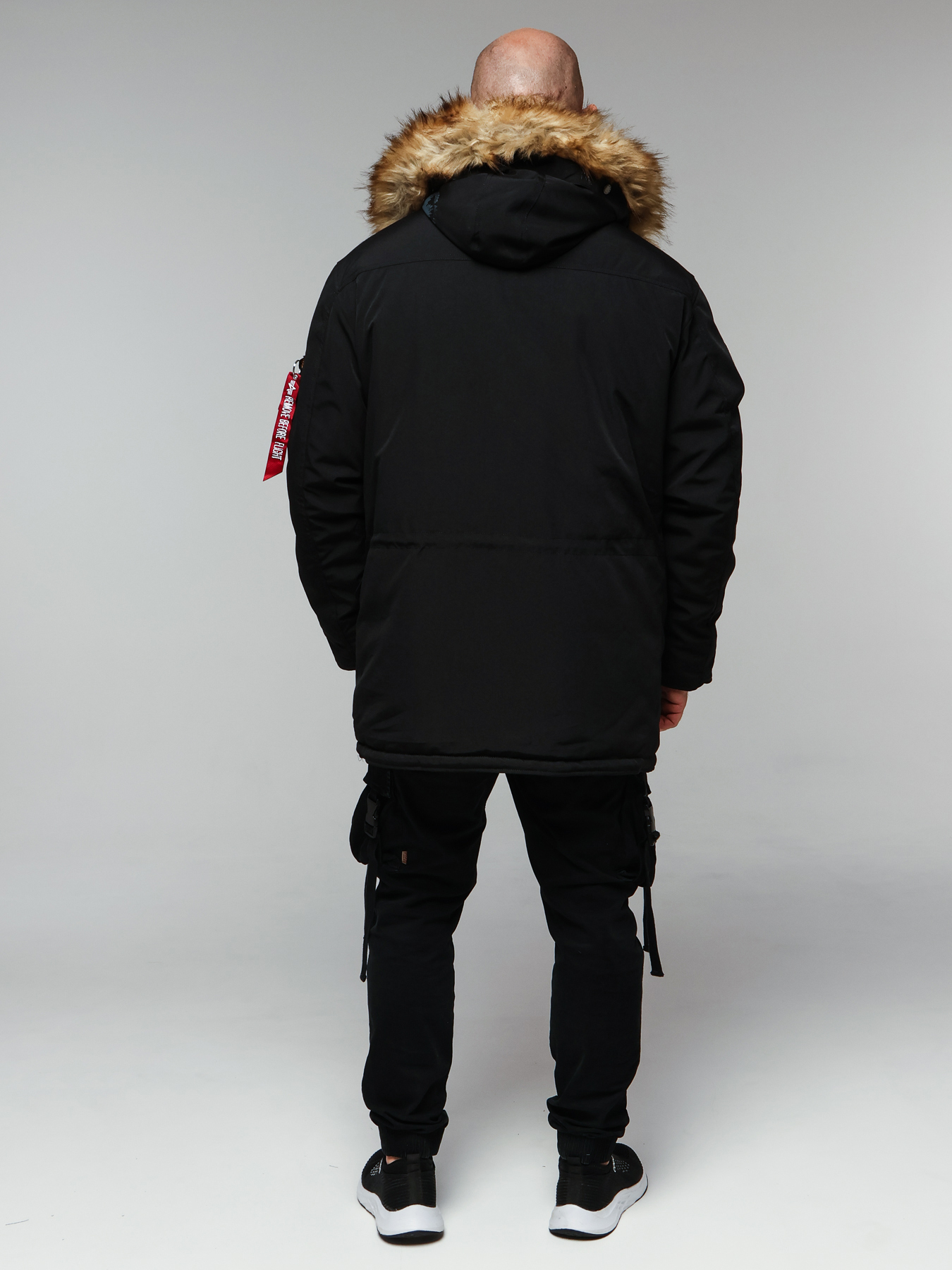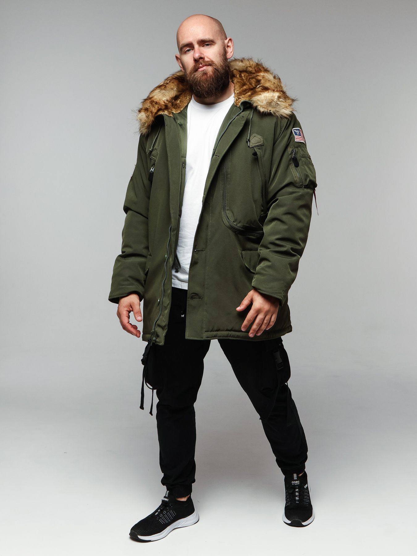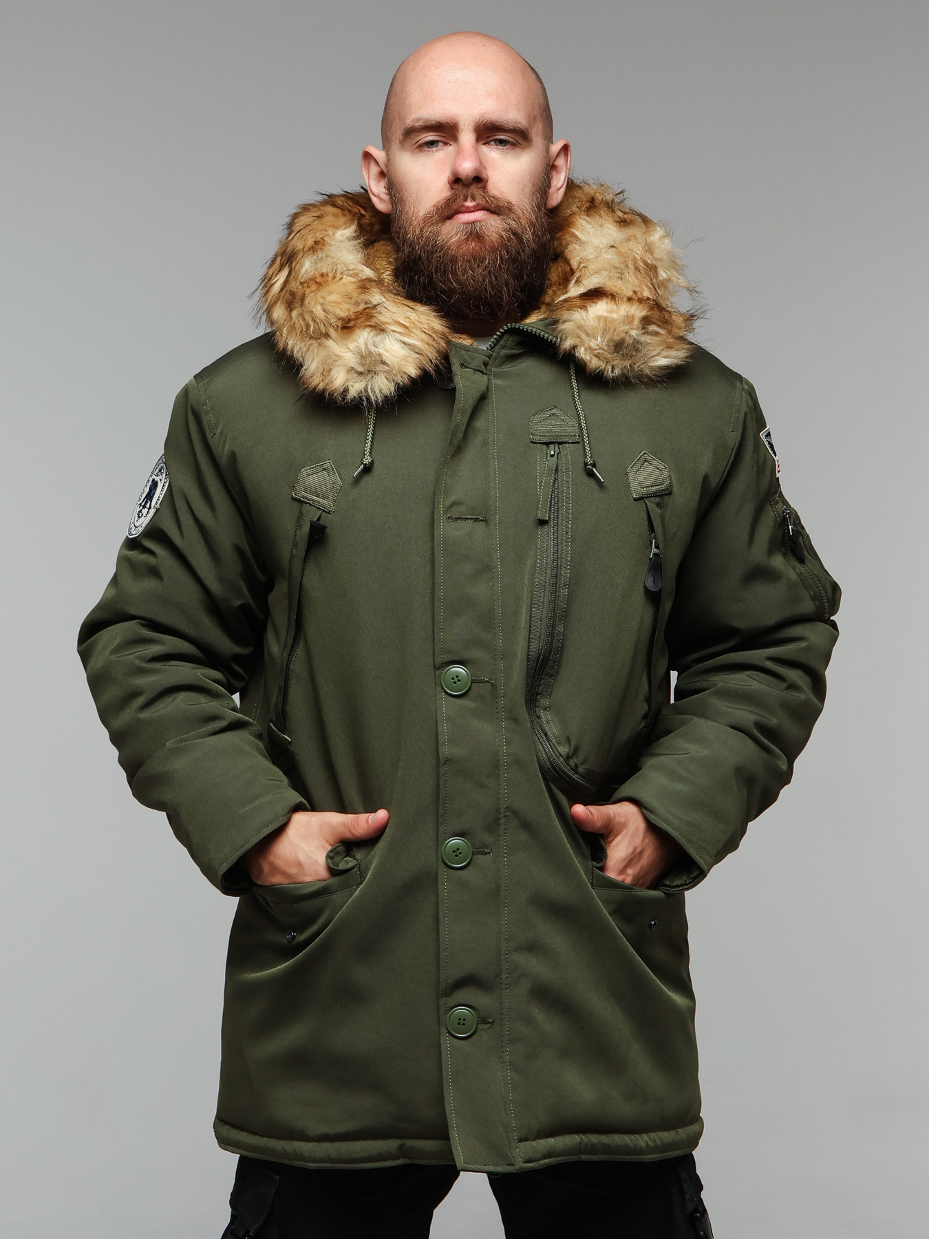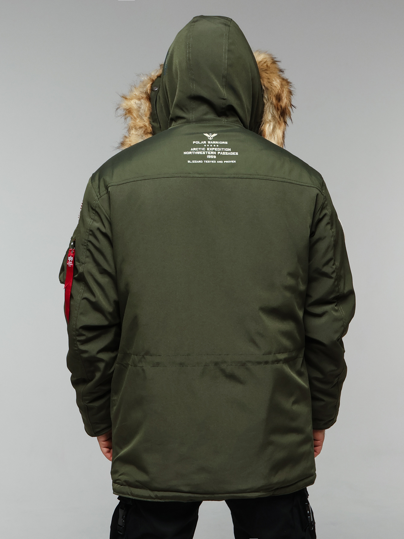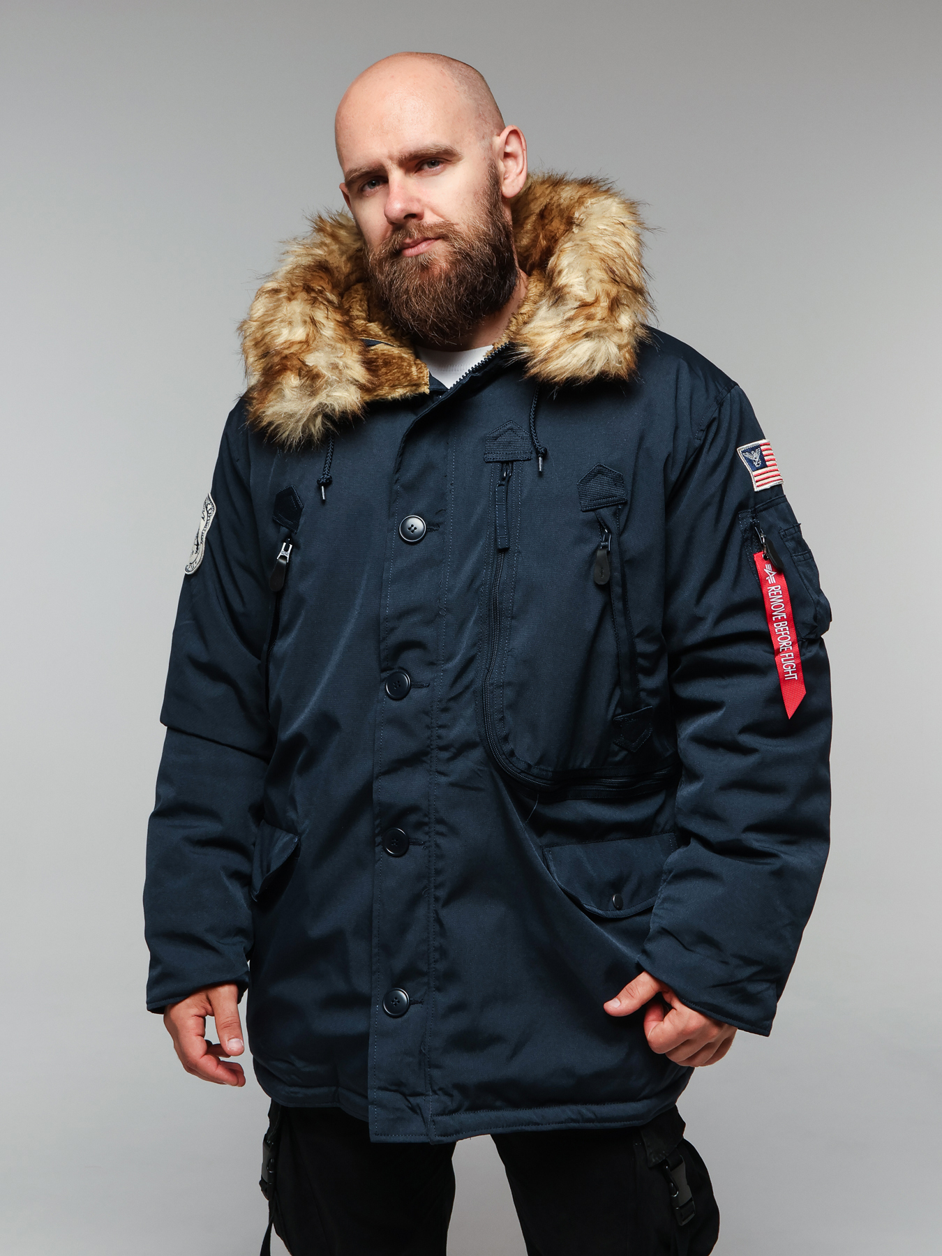 Парка Alpha Industries N-3B Alpine – теплая зимняя парка, внешний материал 53% нейлон, 47% полиэстер, утеплитель полностью из полиэстера. Есть большой карман на груди, ветрозащитный клапан застегивается на пуговицы. Регулируемый капюшон с отстегивающейся опушкой из натурального меха, изнутри отделанный ворсом, согревает шею и позволяет носить парку без шарфа. На внутренней стороне есть шнур утягивающий в поясе. Также в комплекте на рукаве яркий красный брелок-лента.
