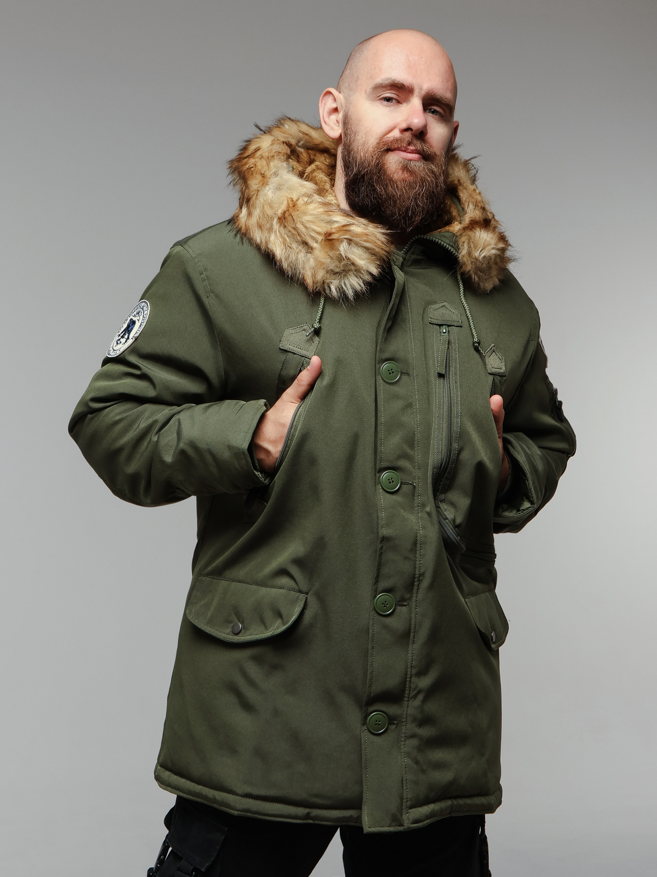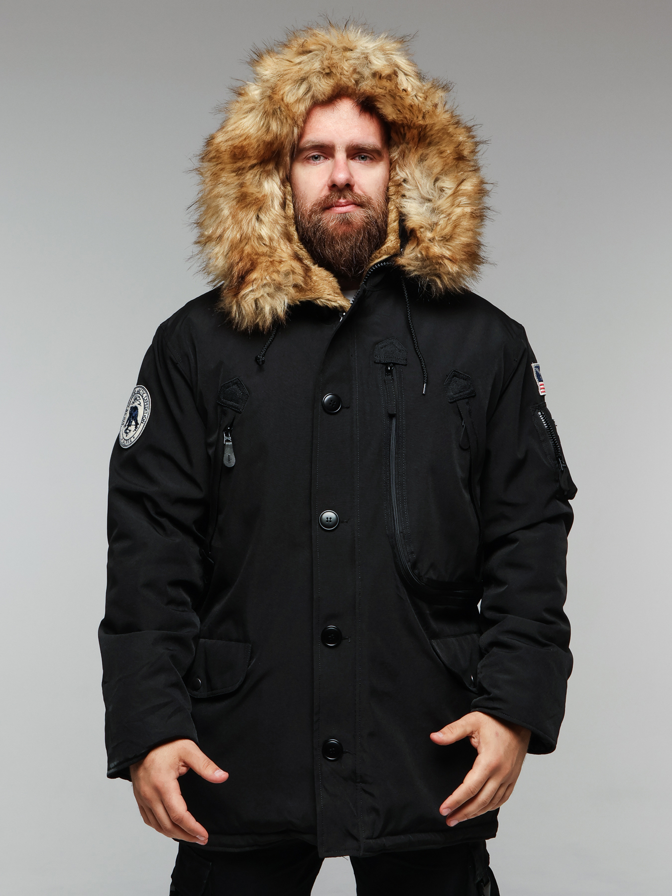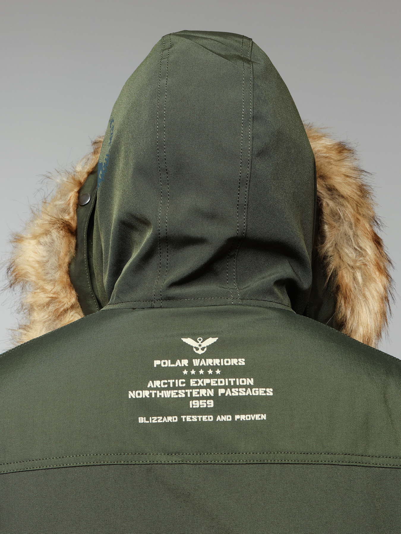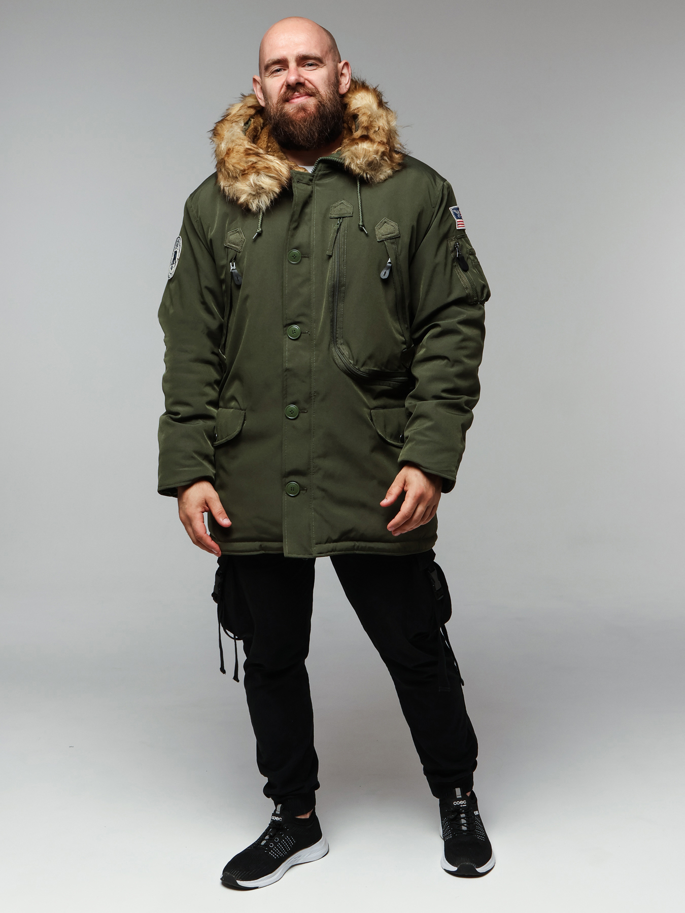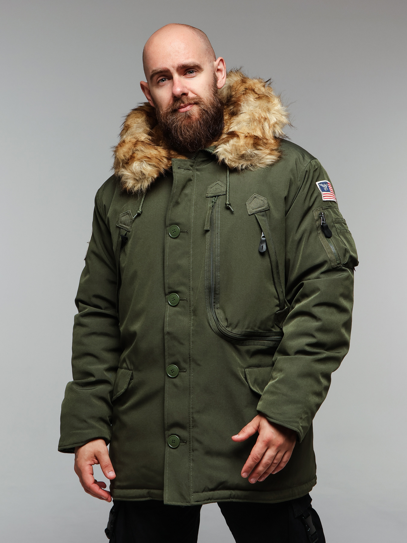 Парка Alpha Industries N-3B Alpine – теплая зимняя парка, внешний материал 53% нейлон, 47% полиэстер, утеплитель полностью из полиэстера. Есть большой карман на груди, ветрозащитный клапан застегивается на пуговицы. Регулируемый капюшон с отстегивающейся опушкой из натурального меха, изнутри отделанный ворсом, согревает шею и позволяет носить парку без шарфа. На внутренней стороне есть шнур утягивающий в поясе. Также в комплекте на рукаве яркий красный брелок-лента.