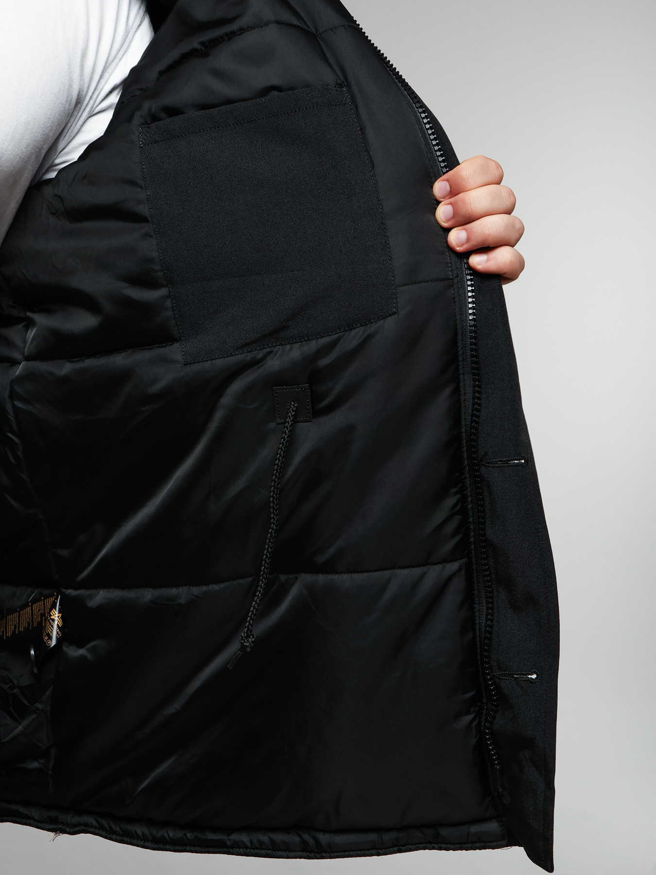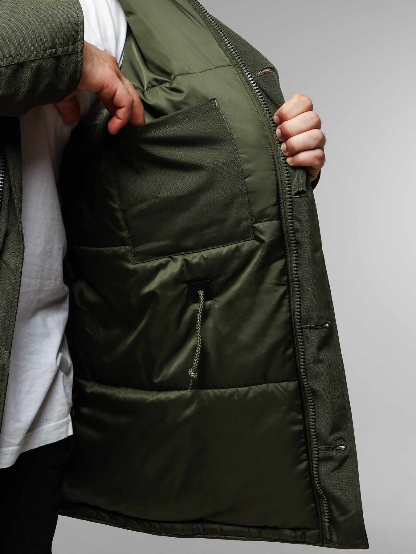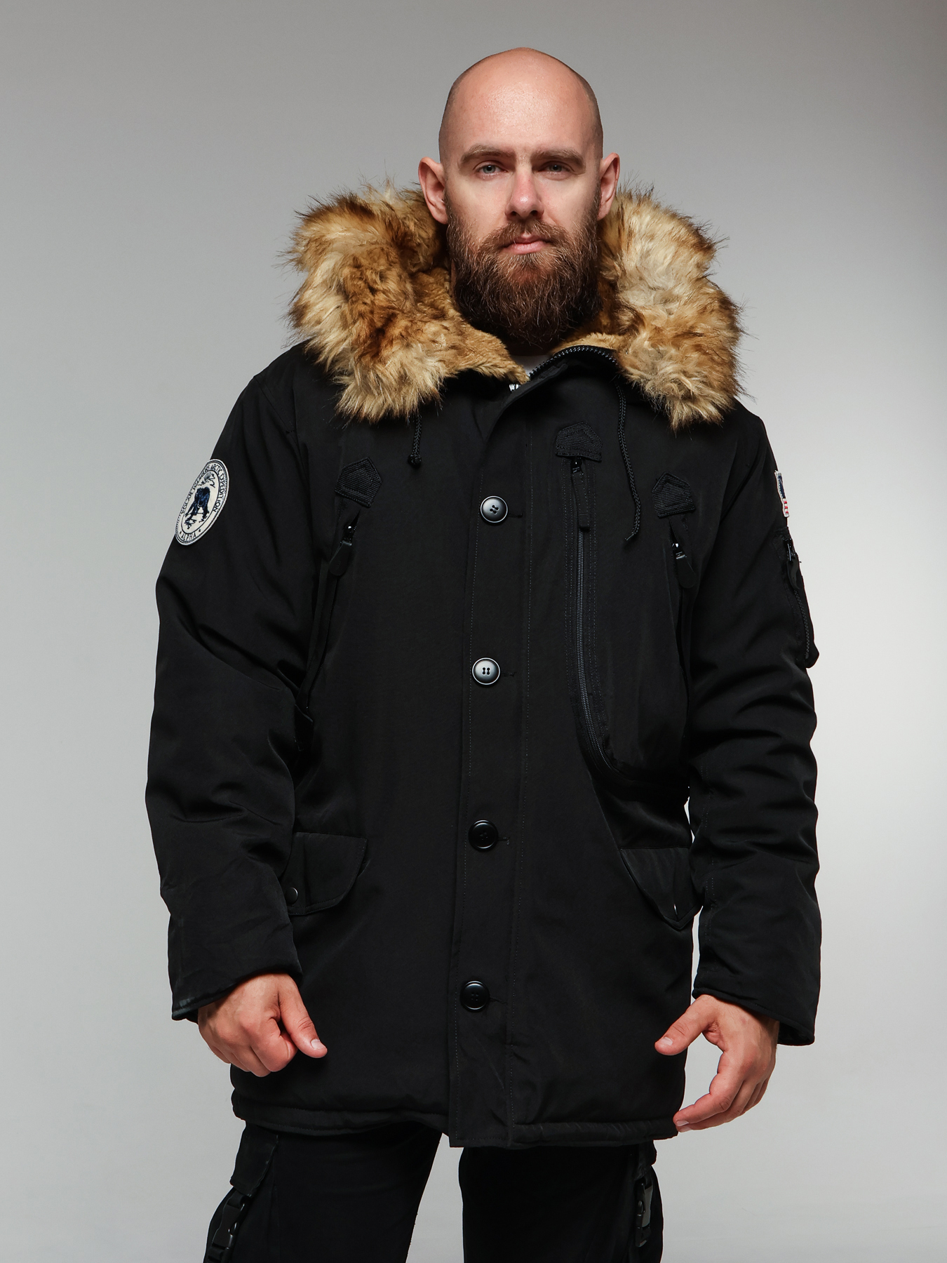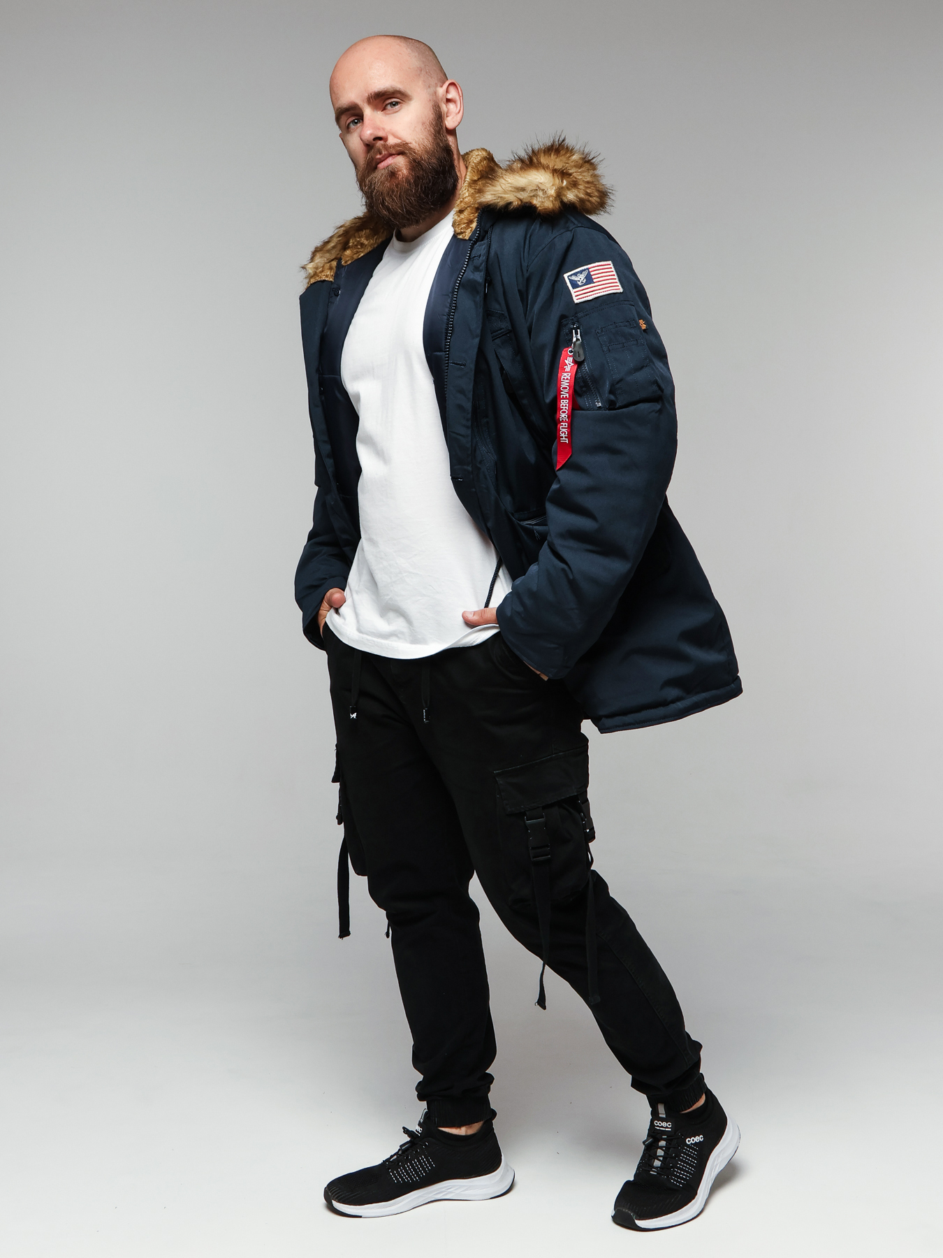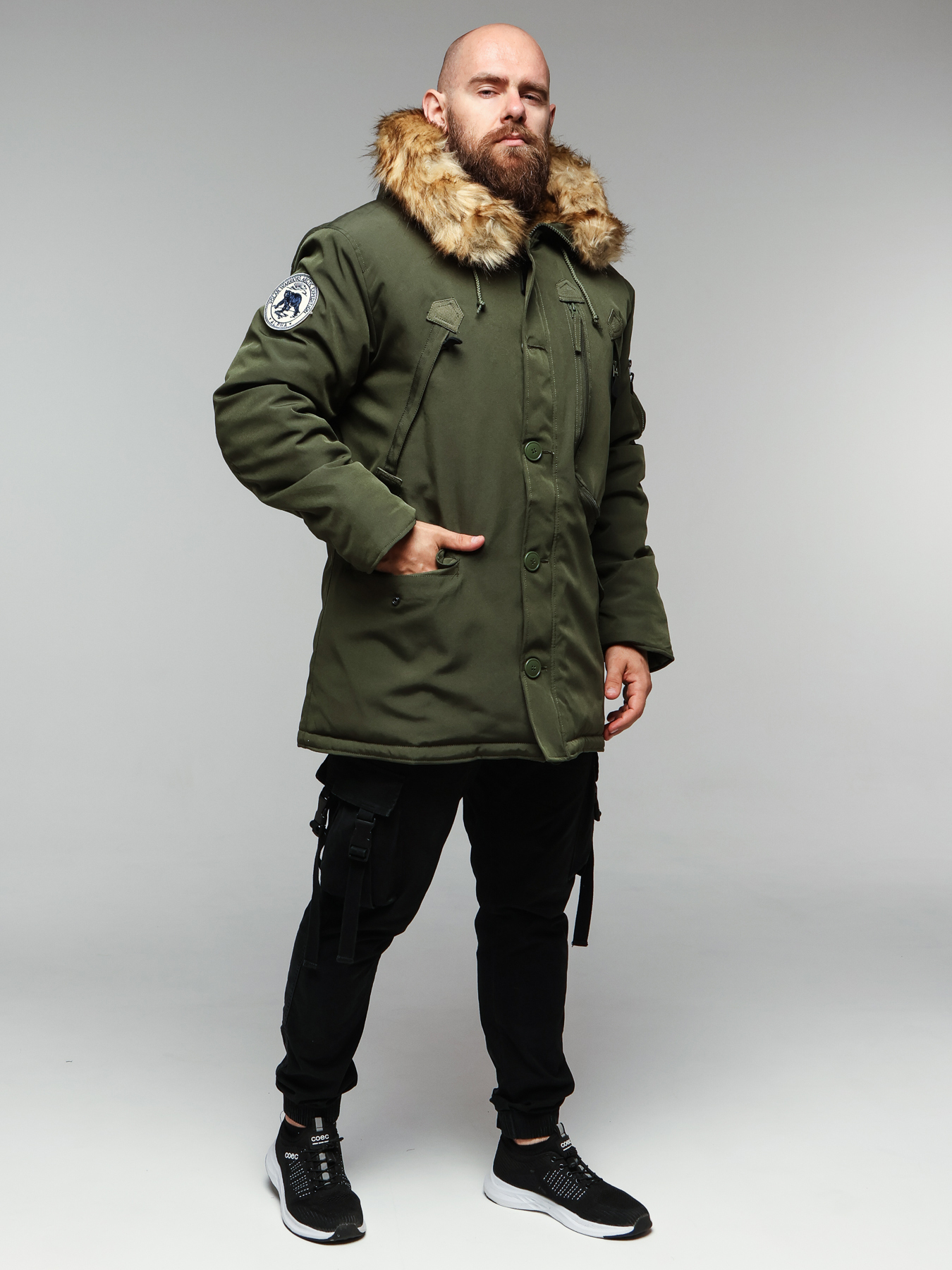 Парка Alpha Industries N-3B Alpine – теплая зимняя парка, внешний материал 53% нейлон, 47% полиэстер, утеплитель полностью из полиэстера. Есть большой карман на груди, ветрозащитный клапан застегивается на пуговицы. Регулируемый капюшон с отстегивающейся опушкой из натурального меха, изнутри отделанный ворсом, согревает шею и позволяет носить парку без шарфа. На внутренней стороне есть шнур утягивающий в поясе. Также в комплекте на рукаве яркий красный брелок-лента.