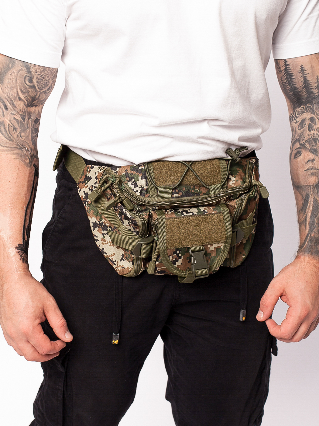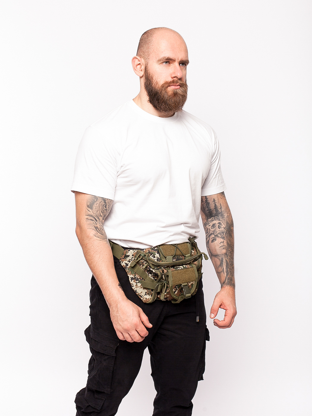 Тактическая сумка на пояс AF Tactic, изготовлена из износостойкого материала - 100% полиэстер. Сумку можно носить как на поясе, так и через плечо. Отлично подойдет для тех, кто любит активный образ жизни, туризм, походы, а так же будет актуальна для армейских учений. Сумка рассчитана на использование в качестве элемента амуниции, довольно объемная, в нее можно поместить все, что заблагорассудится. Оснащена прорезным карманом на молнии, большим карманом на молнии с дополнительным отсеком, накладным карманом на молнии с откидным верхом на фастексе, двумя боковыми накладными карманами на молнии. Имеет сумка дополнительные крепления для подсумков и карабинов. Две нашивки велкро для патчей. В верхней части сумки имеется место для переноса небольшого оборудования, которое можно затянуть на утяжку. Сам пояс шириной 4 сантиметра, прочный и надежный, застежка в виде фастекса. Регулируется размер под Вас очень легко, с помощью двух регулирующих пряжек.