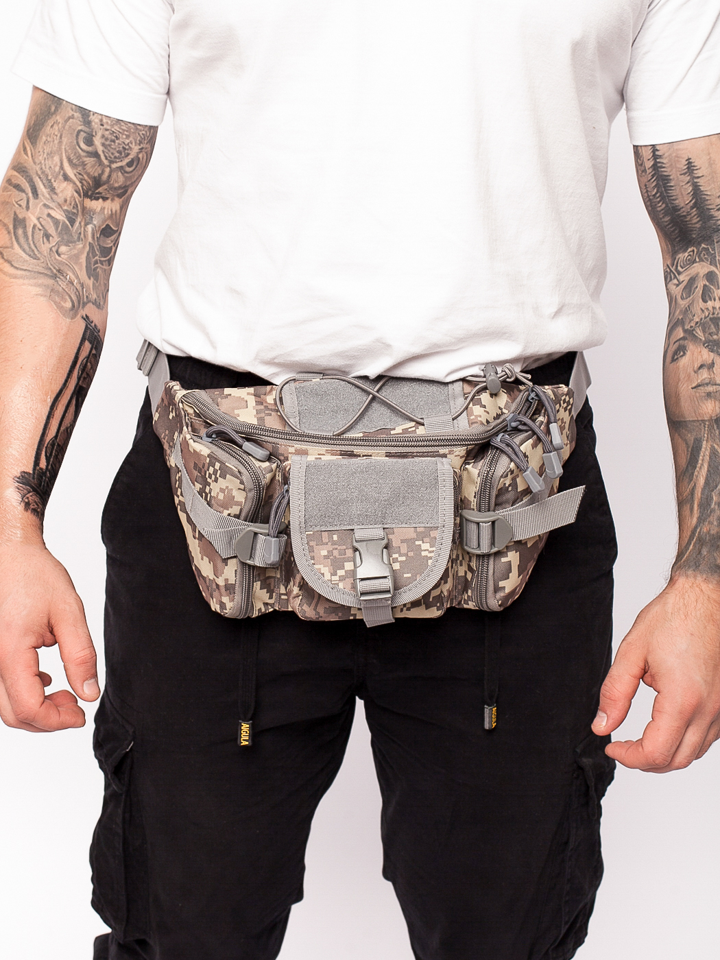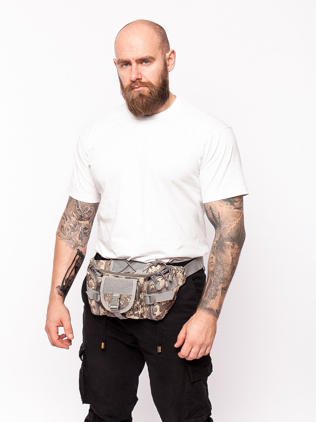 Тактическая сумка на пояс AF Tactic, изготовлена из износостойкого материала - 100% полиэстер. Сумку можно носить как на поясе, так и через плечо. Отлично подойдет для тех, кто любит активный образ жизни, туризм, походы, а так же будет актуальна для армейских учений. Сумка рассчитана на использование в качестве элемента амуниции, довольно объемная, в нее можно поместить все, что заблагорассудится. Оснащена прорезным карманом на молнии, большим карманом на молнии с дополнительным отсеком, накладным карманом на молнии с откидным верхом на фастексе, двумя боковыми накладными карманами на молнии. Имеет сумка дополнительные крепления для подсумков и карабинов. Две нашивки велкро для патчей. В верхней части сумки имеется место для переноса небольшого оборудования, которое можно затянуть на утяжку. Сам пояс шириной 4 сантиметра, прочный и надежный, застежка в виде фастекса. Регулируется размер под Вас очень легко, с помощью двух регулирующих пряжек.