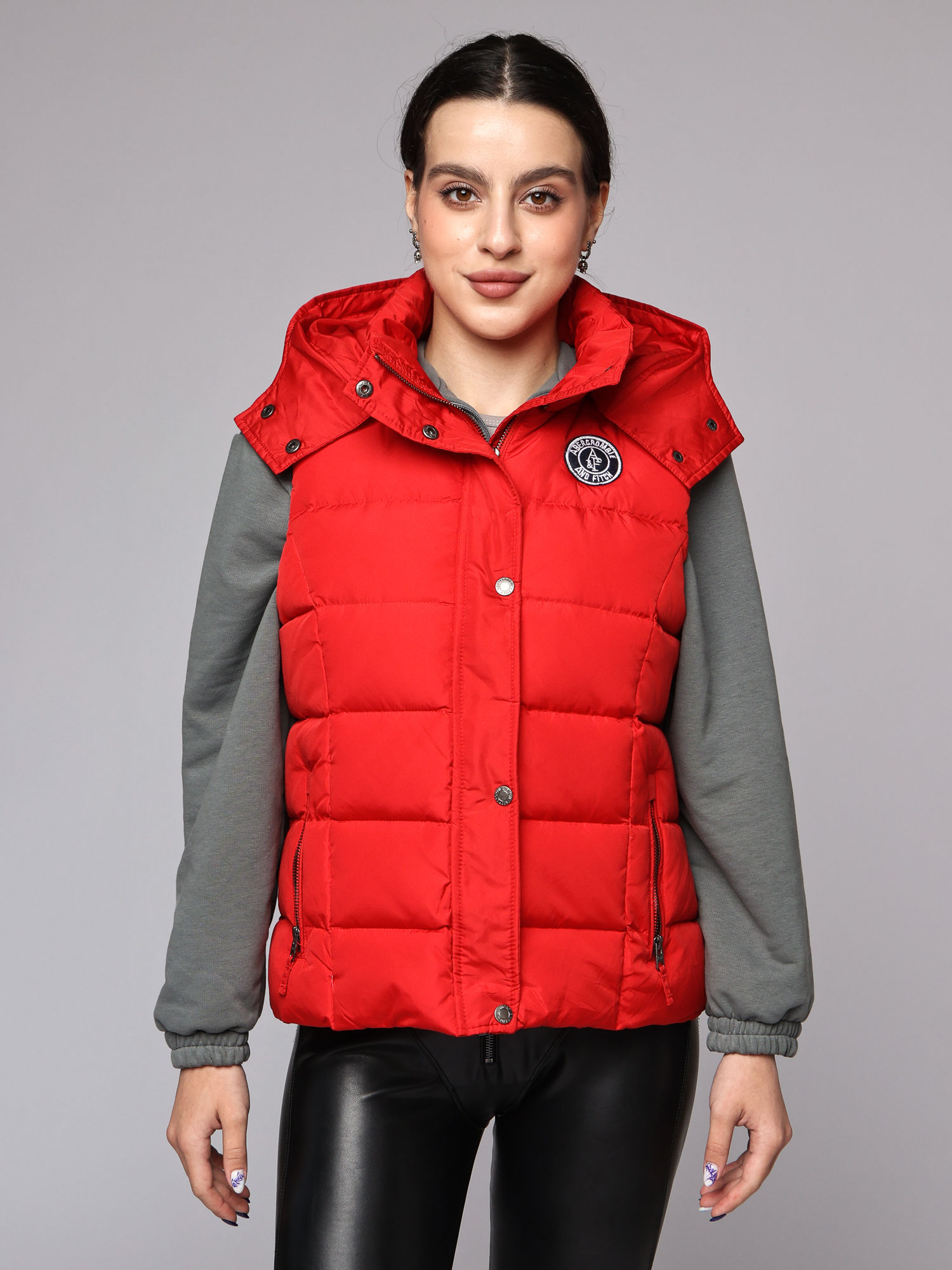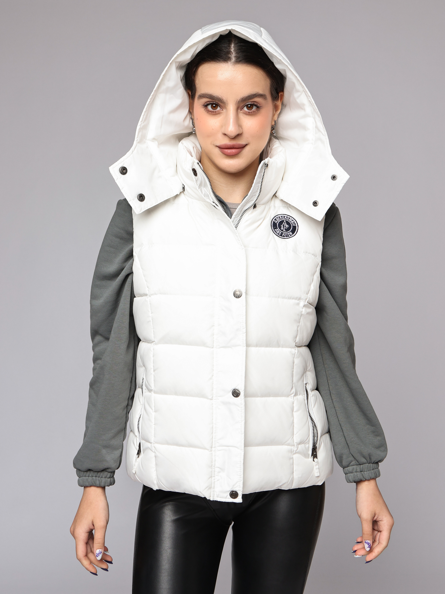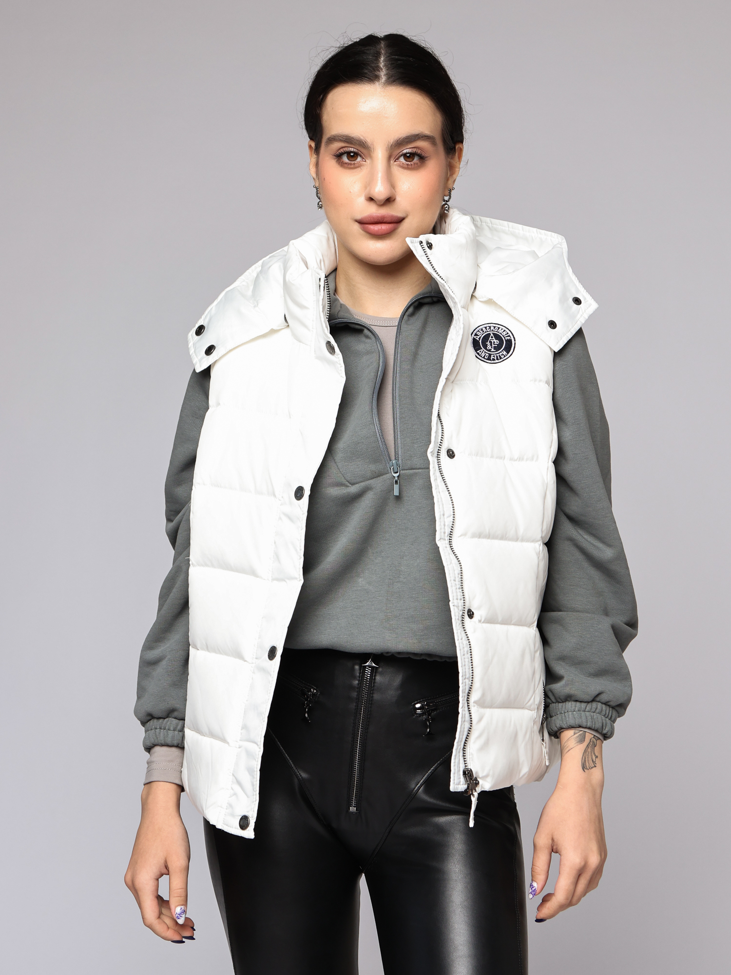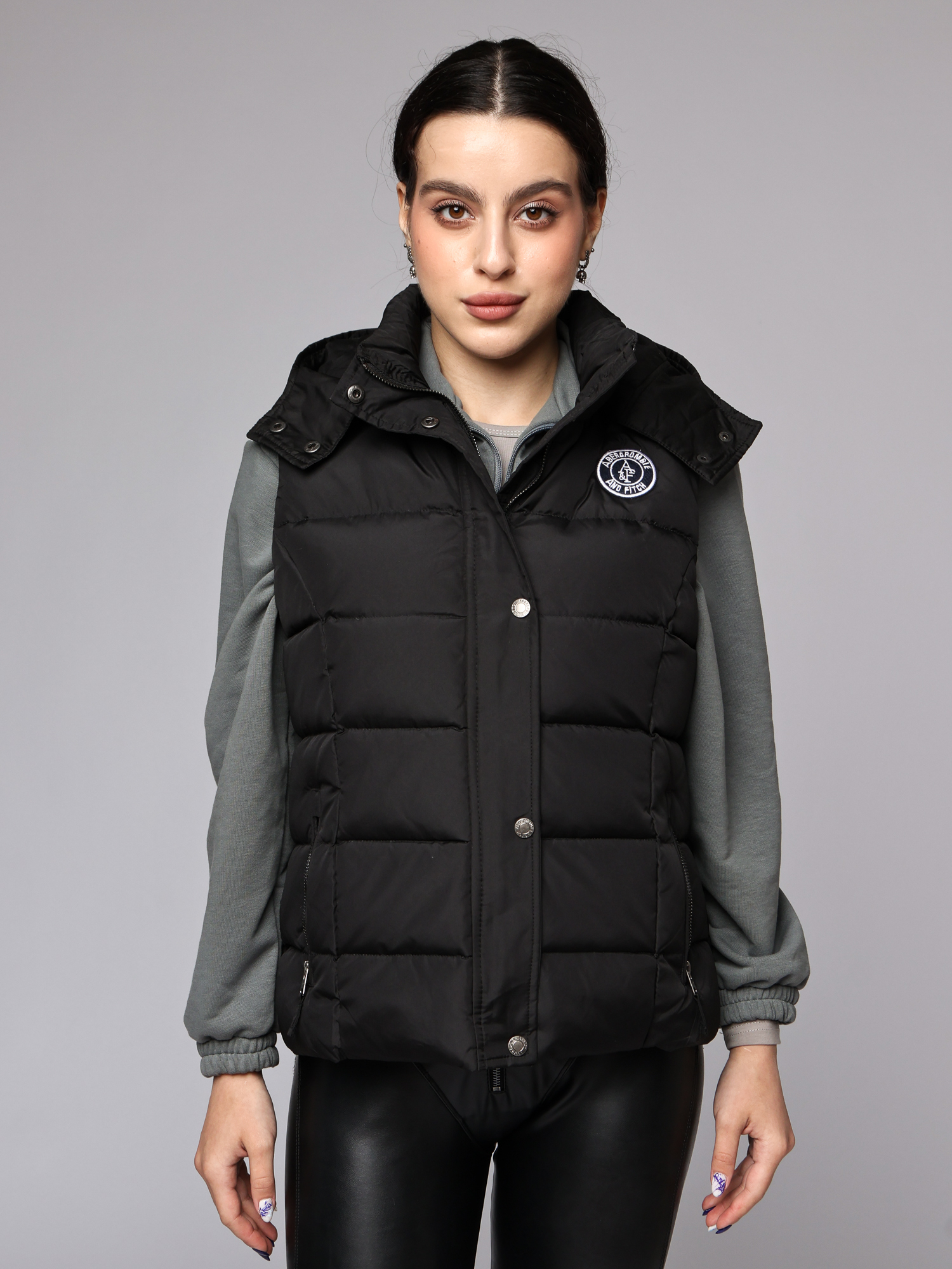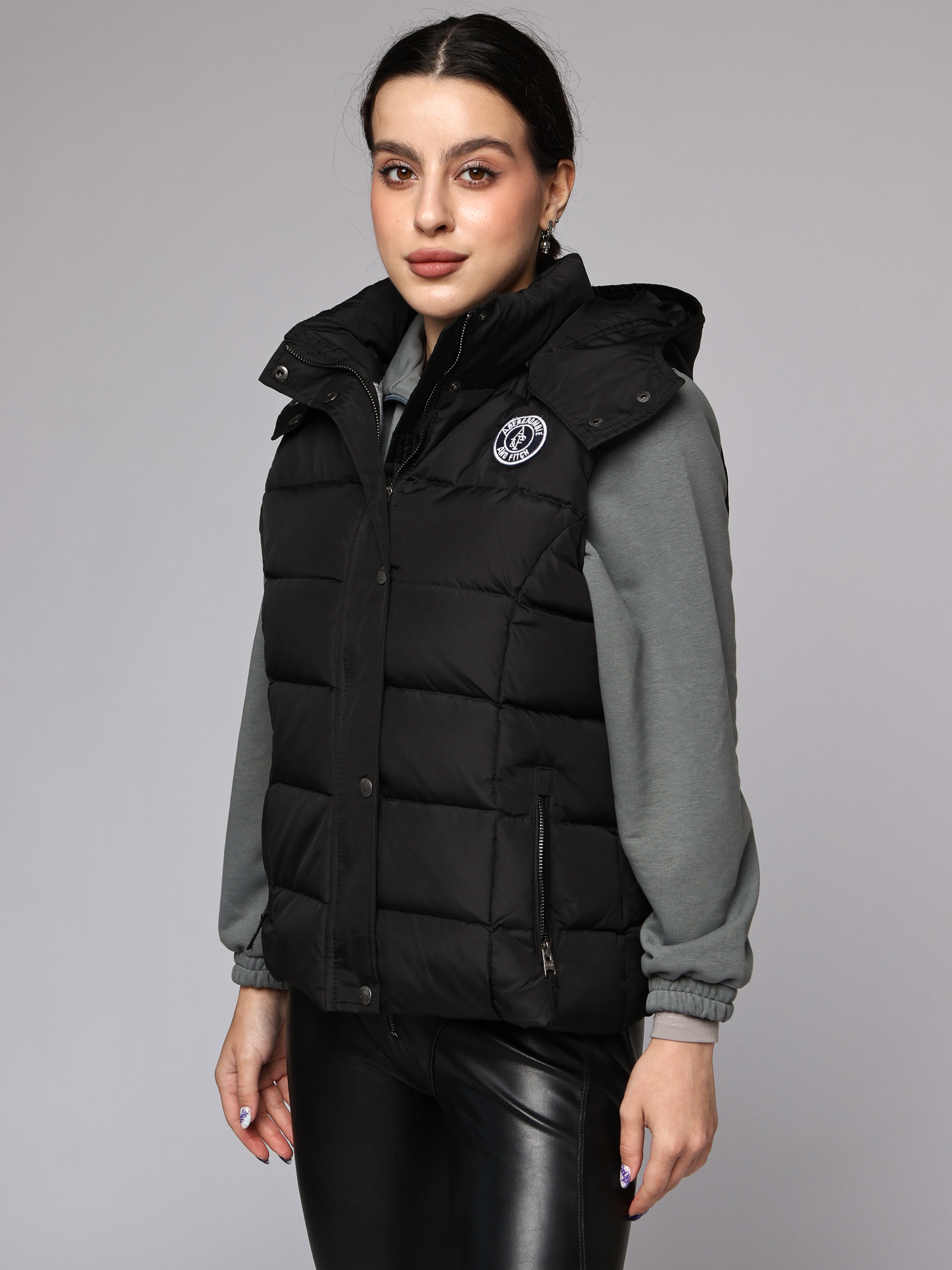 Женский утепленный жилет от бренда Abercrombie & Fitch. Внешний материал жилета - 100% нейлон, а внутренний утеплитель состоит из утиного пера и пуха. Капюшон отстегивается и имеет дополнительный воротник на кнопках, который защитит шею от ветра. Застегивается жилет на молнию и кнопки. Данная модель имеет два прорезных боковых кармана на молнии, а также один внутренний карман. На груди расположен логотип бренда. Такой базовый жилет отлично впишется в Ваш гардероб и будет защищать Вас от прохладной погоды.
