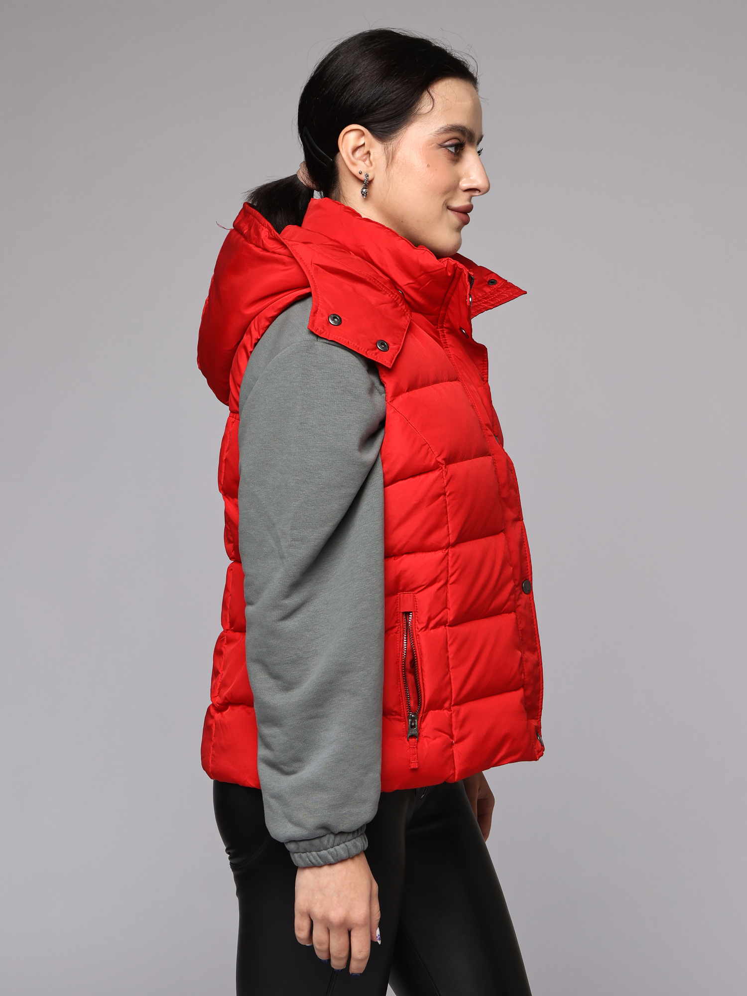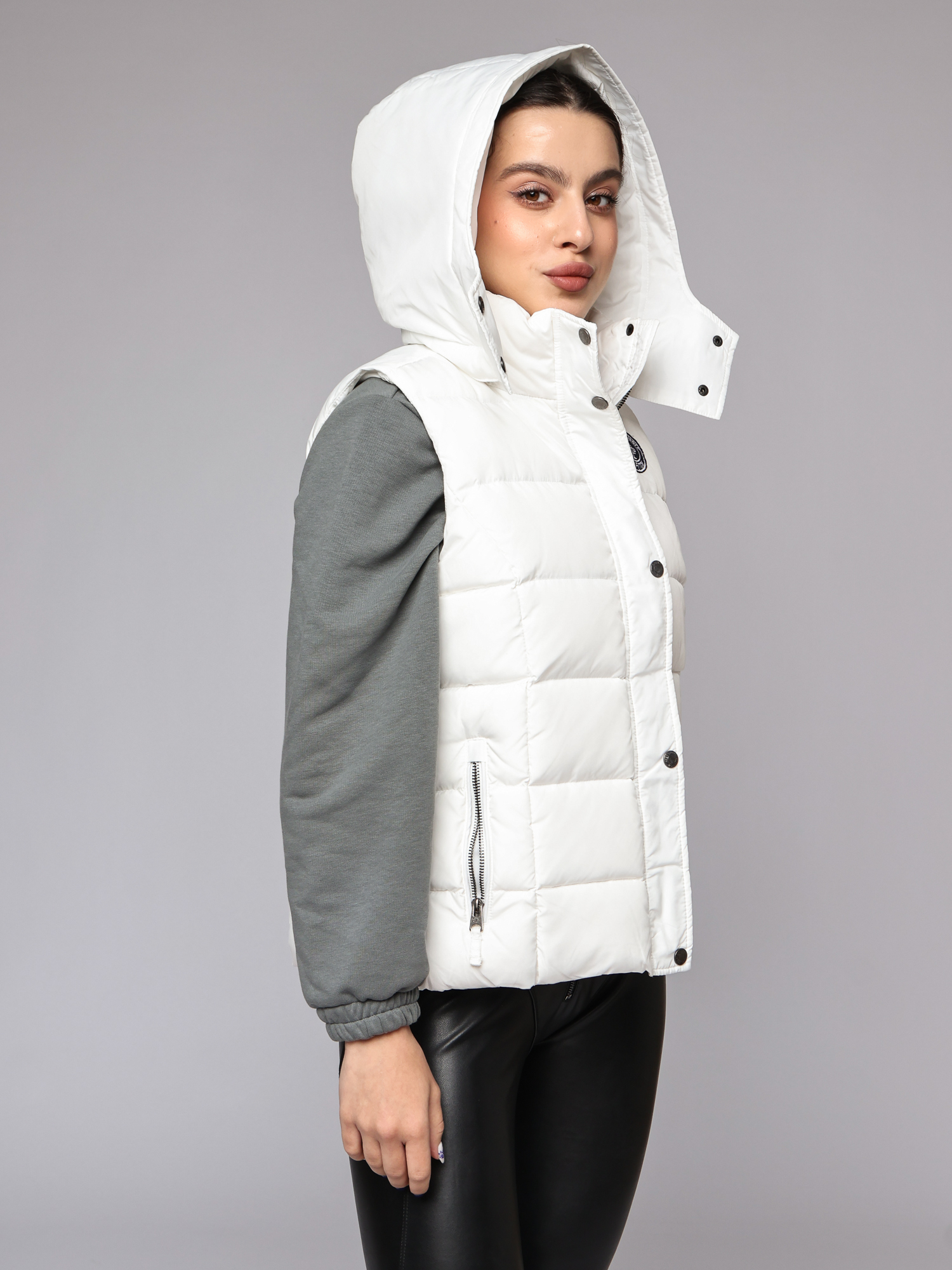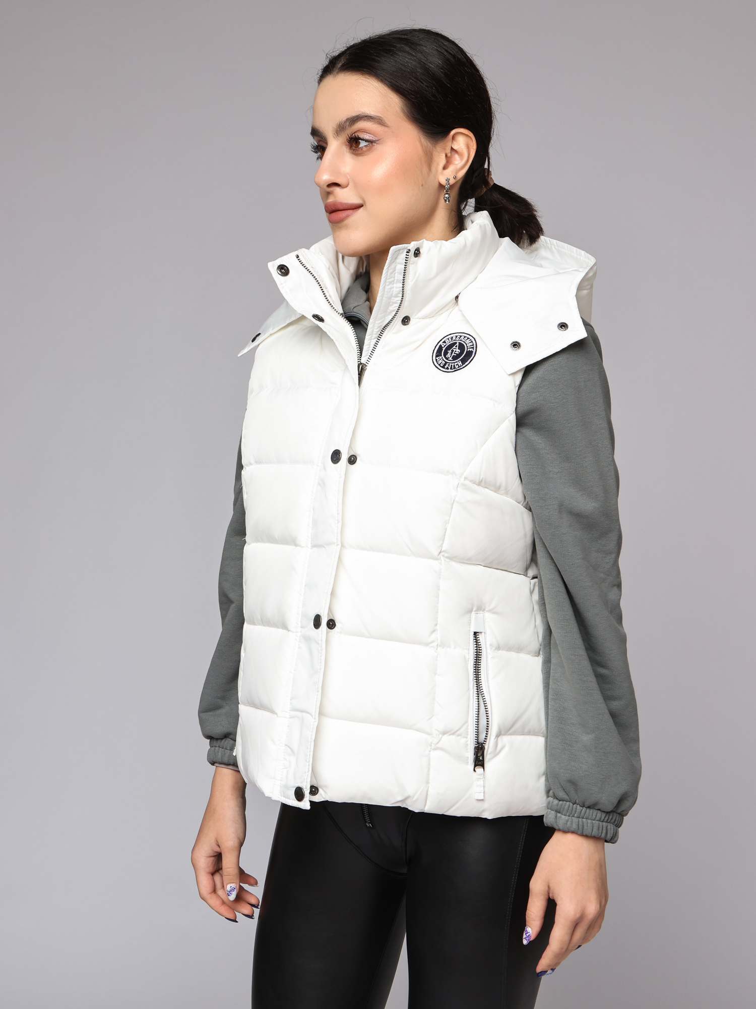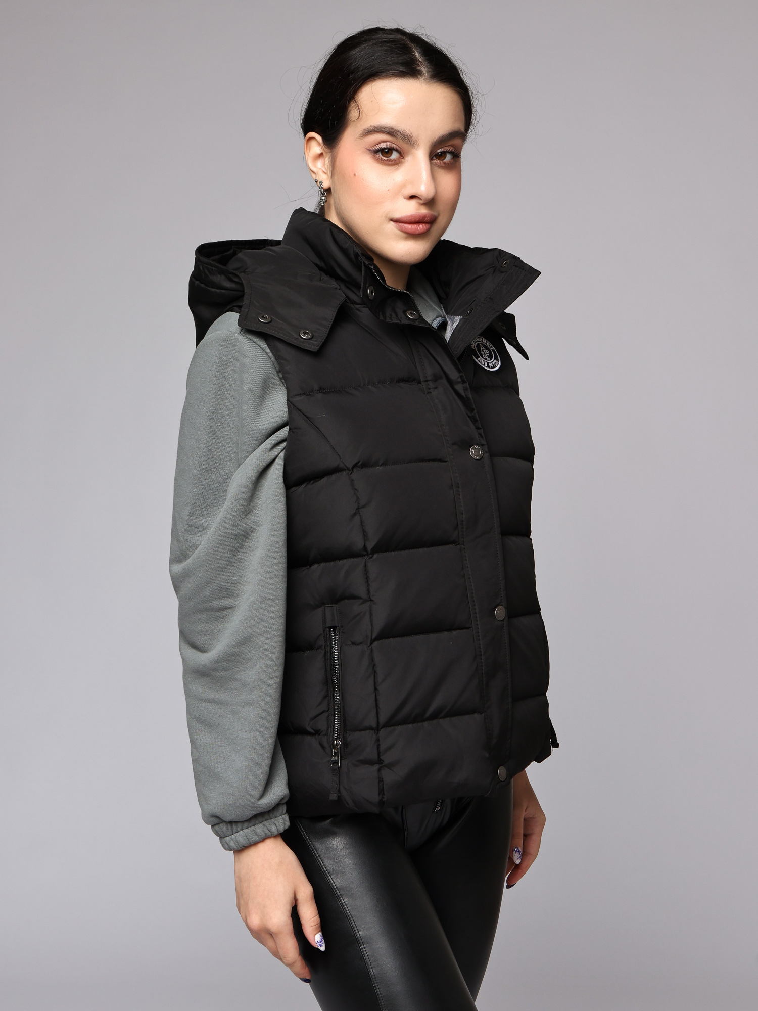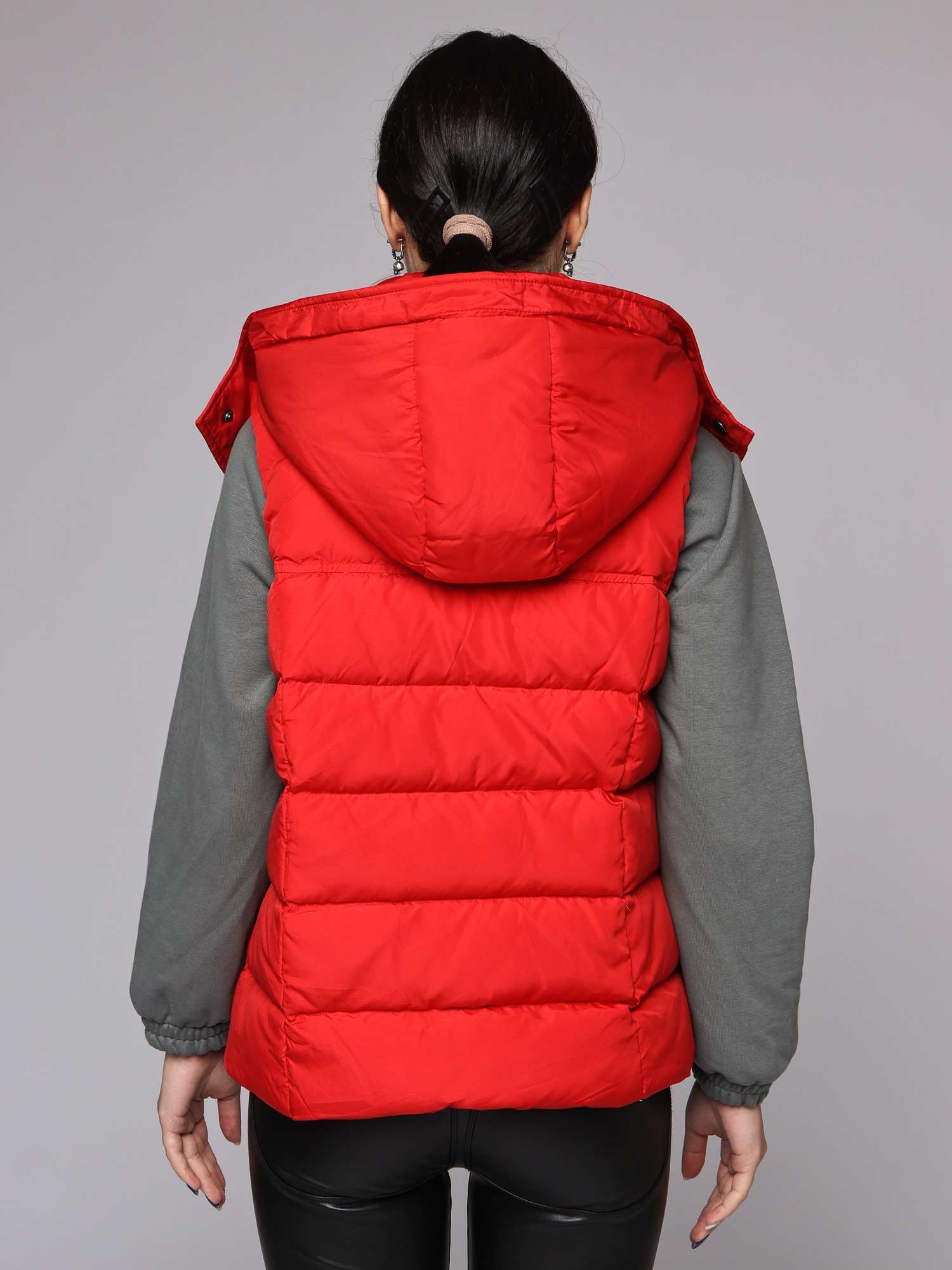 Женский утепленный жилет от бренда Abercrombie & Fitch. Внешний материал жилета - 100% нейлон, а внутренний утеплитель состоит из утиного пера и пуха. Капюшон отстегивается и имеет дополнительный воротник на кнопках, который защитит шею от ветра. Застегивается жилет на молнию и кнопки. Данная модель имеет два прорезных боковых кармана на молнии, а также один внутренний карман. На груди расположен логотип бренда. Такой базовый жилет отлично впишется в Ваш гардероб и будет защищать Вас от прохладной погоды.